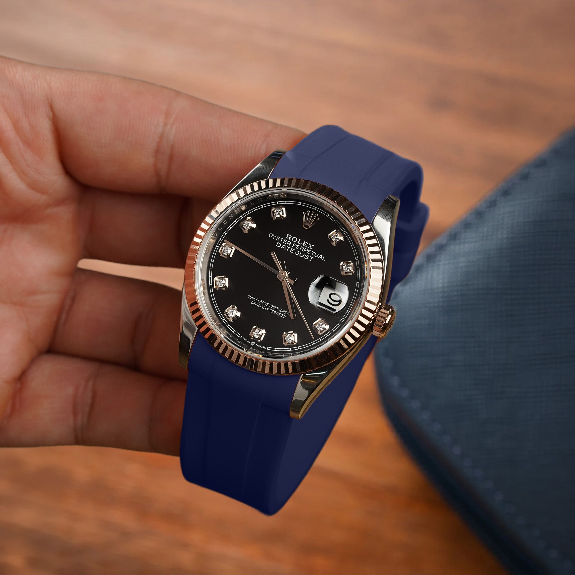 Trang chủ / Dây đồng hồ Rolex / Dây Cao Su Màu Xanh Dương Cho Rolex Datejust 36mm ref.12*** Khóa Đơn